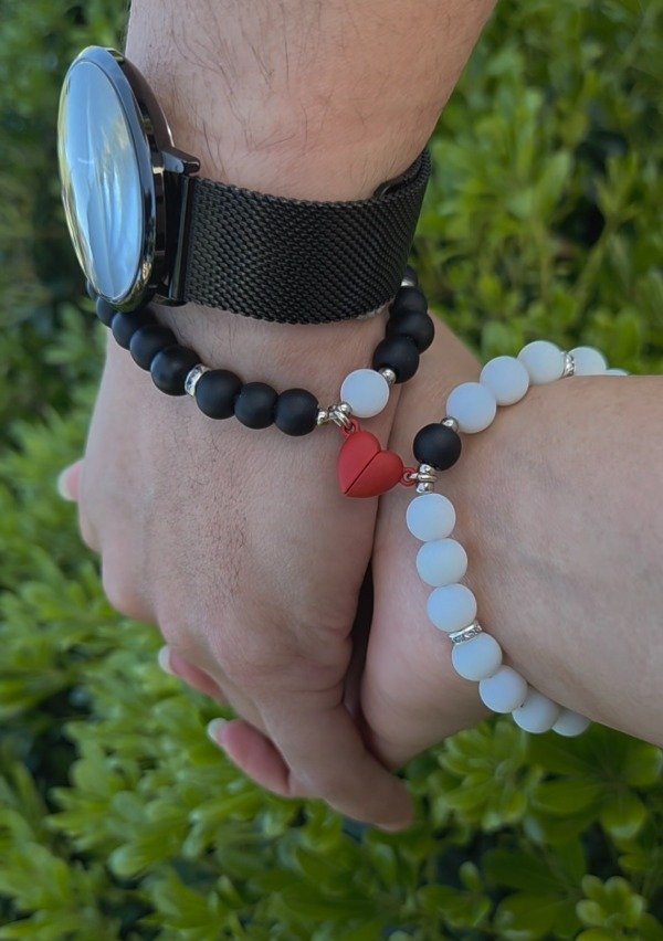 •2 Pulseras de perlas mate con dije iman engomado en forma de corazon